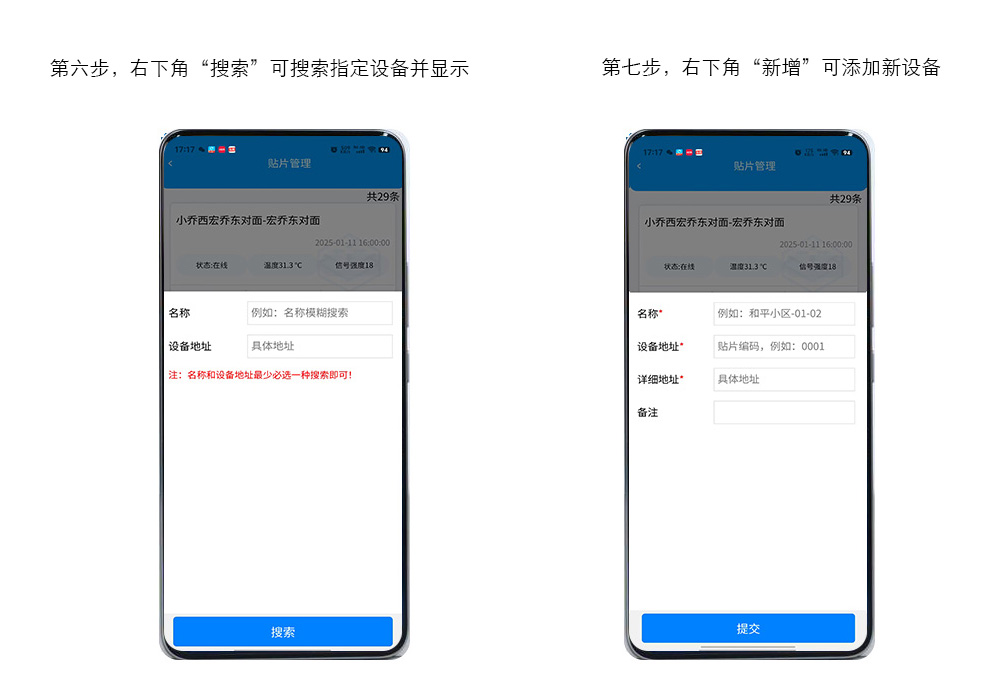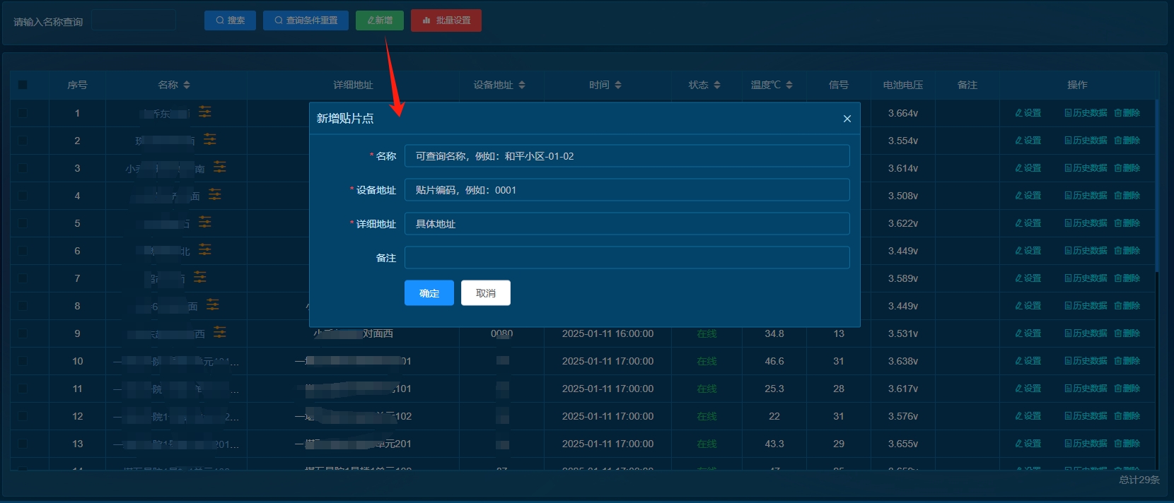 管理账户可以针对已安装设备进行新增并填写设备位置信息,点击“新增”,名称:可以随意定义设备名称,建议使用小区名+楼号单元以便查询,设备地址:当前设备上的设备号,必须确认正确;详细地址:可以填写设备所在的详细地址;备注:可以填写备注信息以便维护使用!点击“确定”后就可以在列表内显示增加的设备信息。