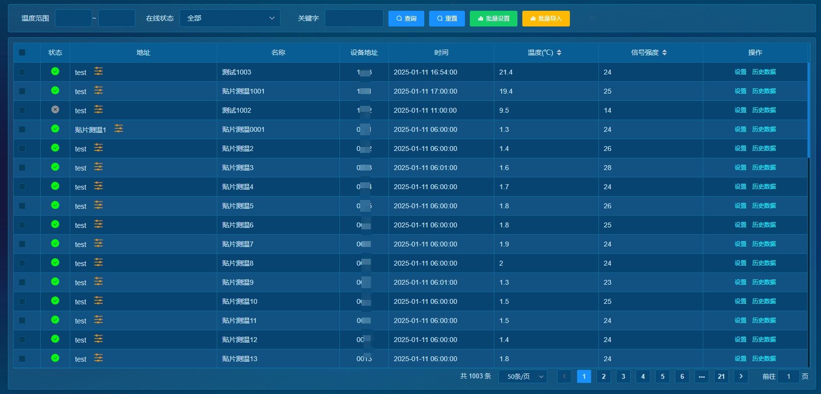 一、点击系统“贴片测温管理”,显示所有贴片测温设备列表,并可以点击分页查询剩余设备;
