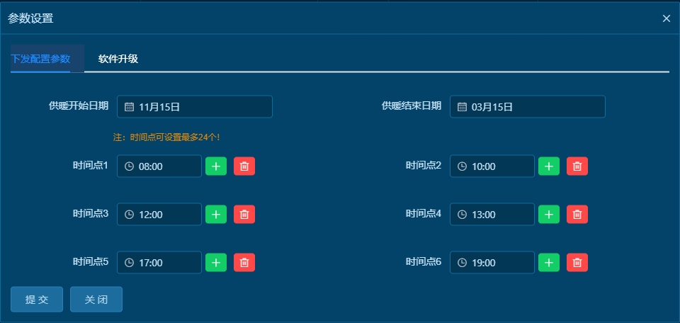 支持远程配置,可以通过平台下发采暖时间点、供暖起止日期。
