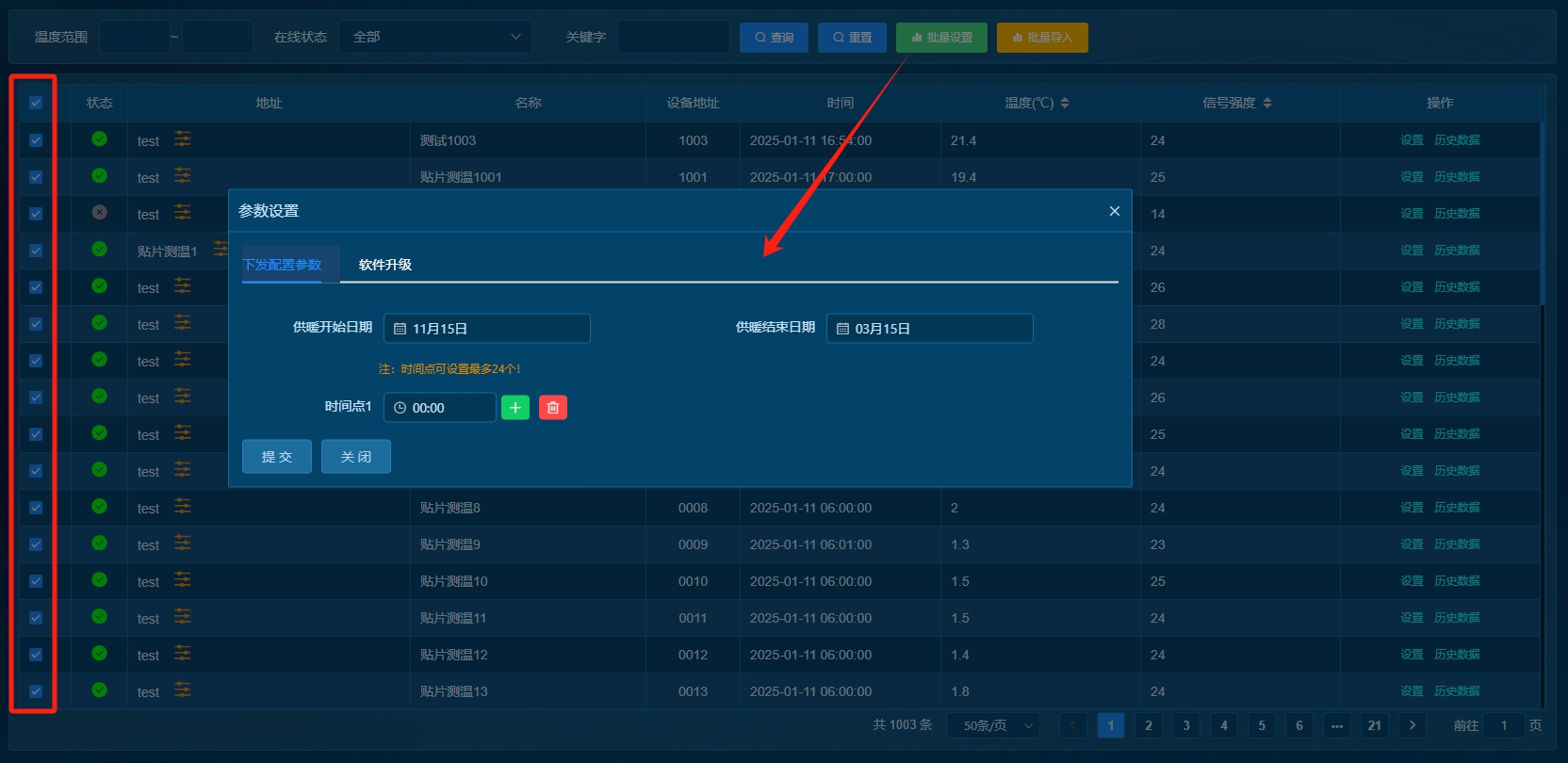 2、多选设备后,点击顶部的"批量设置",可以针对所选设备操作上传间隔时间和指定设备升级操作