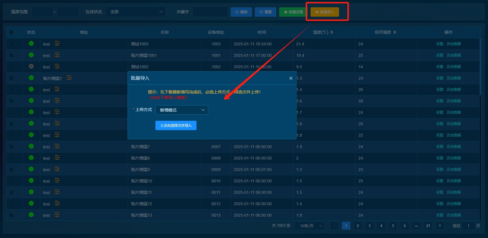 新设备可以通过“批量导入”,增加新设备,必须按照导入模板填写后,选择“新增模式”则是增加新设备,选择“更新已有设备”则是修改已存在的设备信息!