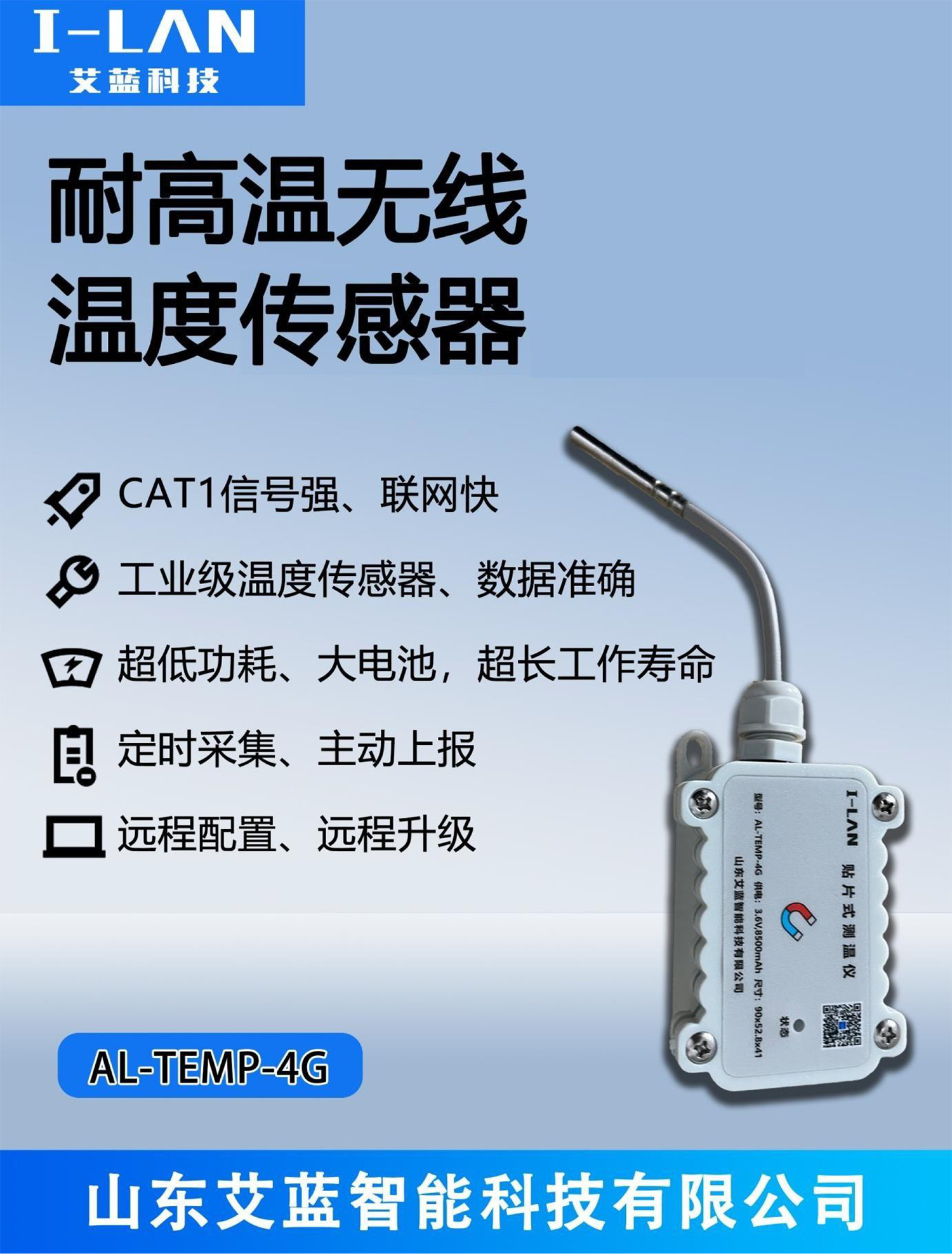 AL-TEMP-4G是山东艾蓝智能科技有限公司研发的一款耐高温无线温度传感器终端。主要应用于高温管道测温。可向指定平台服务器以无线方式定时上报数据。