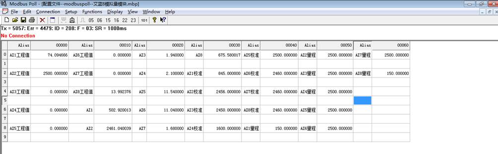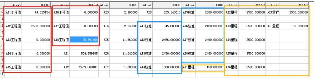 7.红色框内数据是最终显示值,蓝色框数据是校验值,黄色框内数据是最大量程。最大的量程就是需要采集的设备模拟量的最大量程,红色框最终值是经过校验之后得到的准确数值。没框的数据是数字量,是4-20mA转变的数值,一般不需要操作。