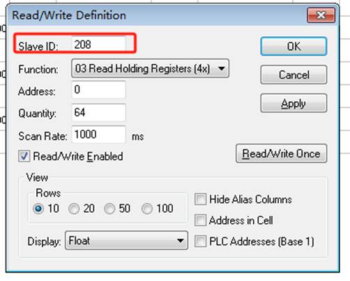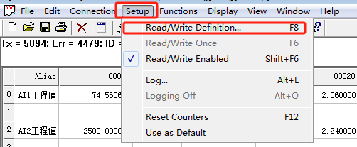 5.点击Setup,点击Read/Writ Definition... F8进入修改设备地址数据