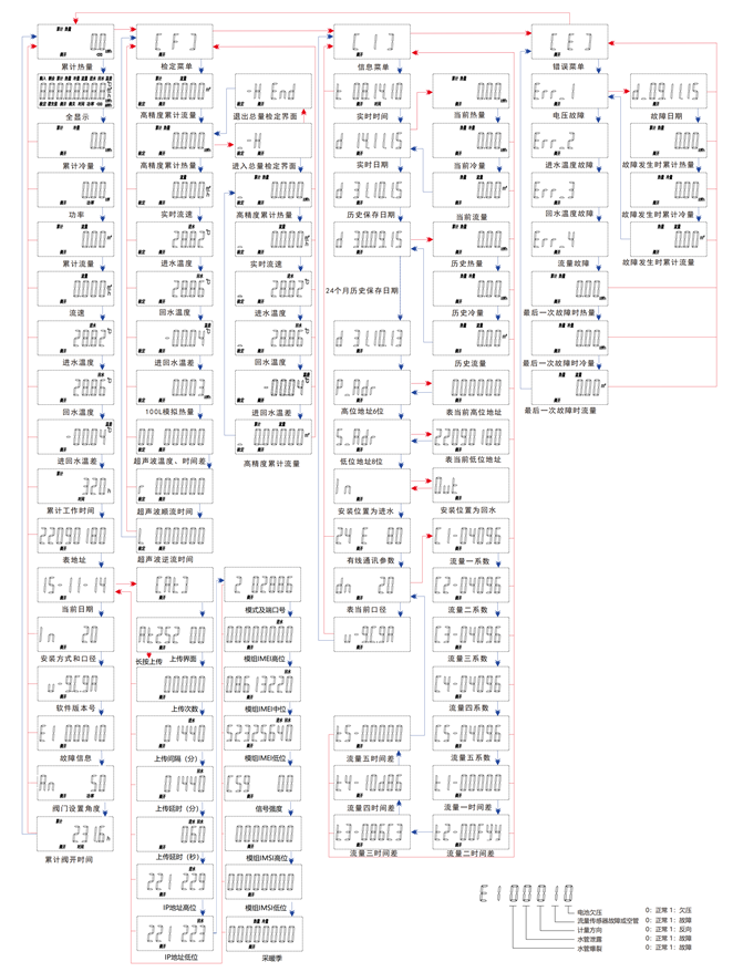 仪表液晶常显为累积热量界面或处于屏保状态,按动按键可唤醒。显示分用户界面、检定界面、数据信息界面、故障界面、AT信息界面共五级菜单界面,短按按键可在当前菜单内实现翻页查询功能,长按按键可进入下一级菜单页面或当前显示页所对的内容选项(如下图),2分钟内(检定界面为2h)不做任何操作会自动退出返回到常显界面。.