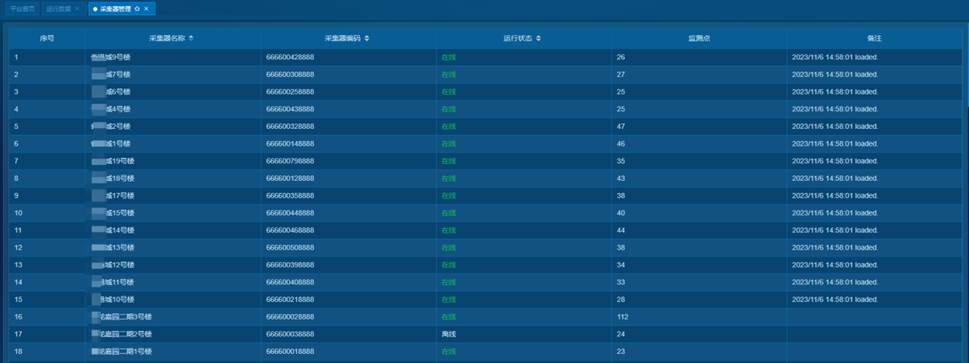 采集器管理是针对户阀的采集设备进行管理的界面,用于设备所在小区楼号、采集器编码、在线运行状态以及采集器下所挂载的设备进行信息查看和修改。