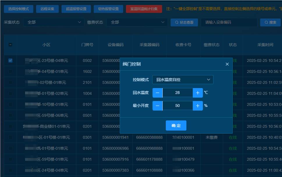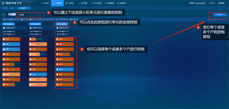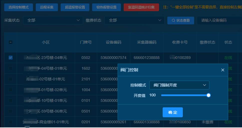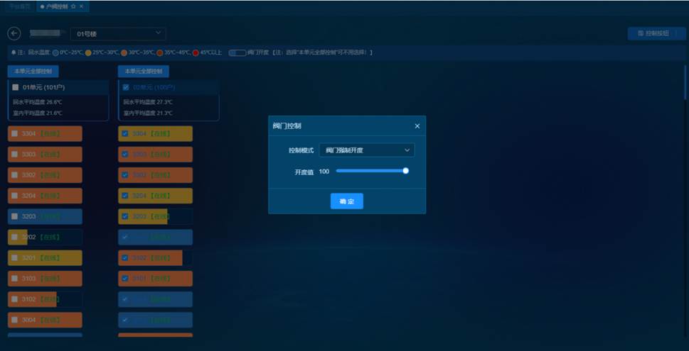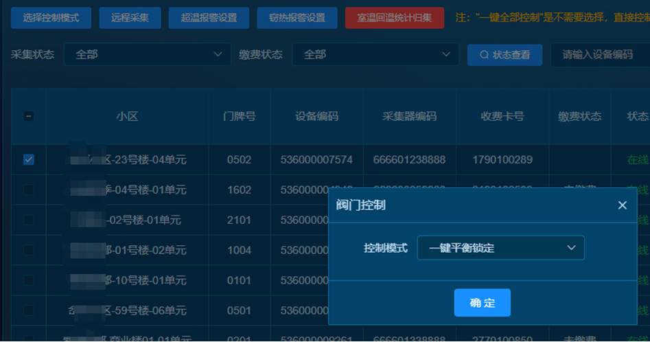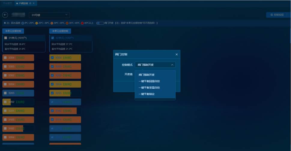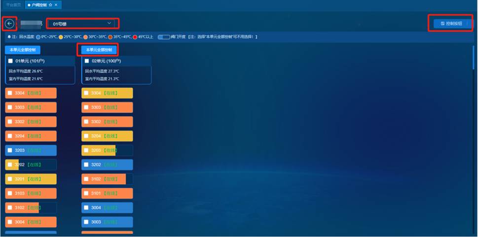 页面其他按钮:选择楼号,根据指定楼号进行控制;单元批量控制,根据指定小区单元进行控制;指定阀门控制,返回列表等。