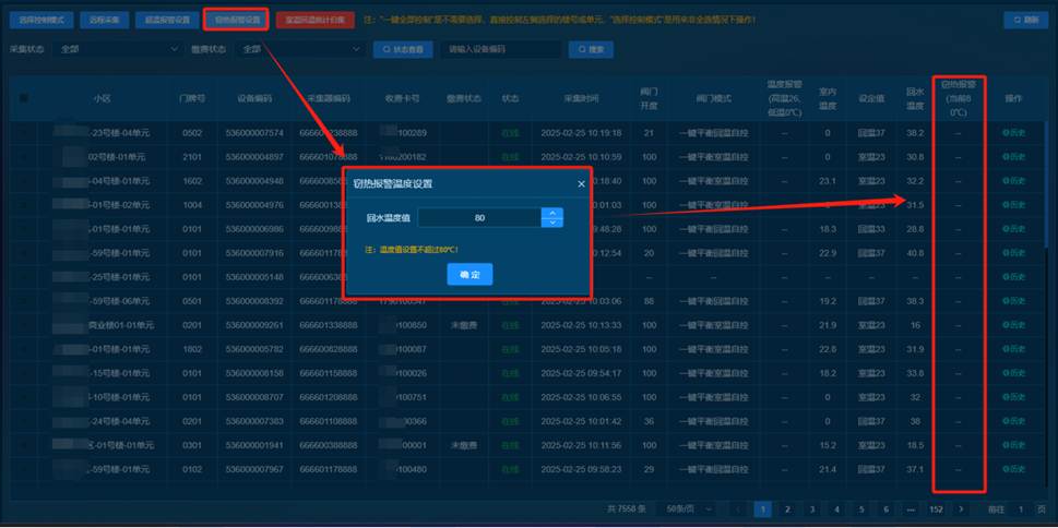 4) 窃热报警设置:点击“窃热报警设置”弹出设置回水温度值,设置后,户阀可根据采集的回水温度判断是否有窃热报警信息。