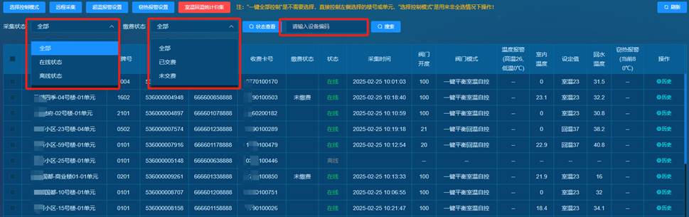 6)按条件查询:可以根据采集状态、缴费状态进行数据筛选和显示,也可以根据指定设备编码查询指定设备。