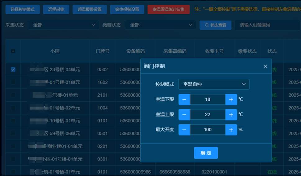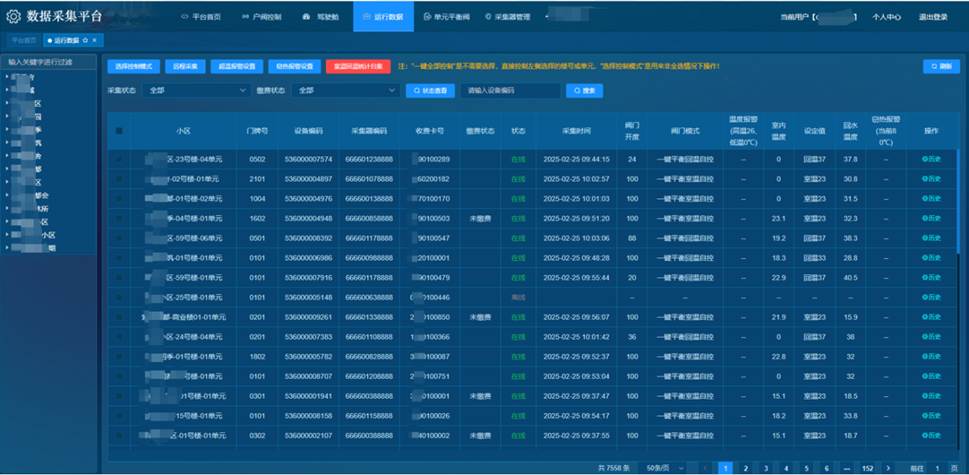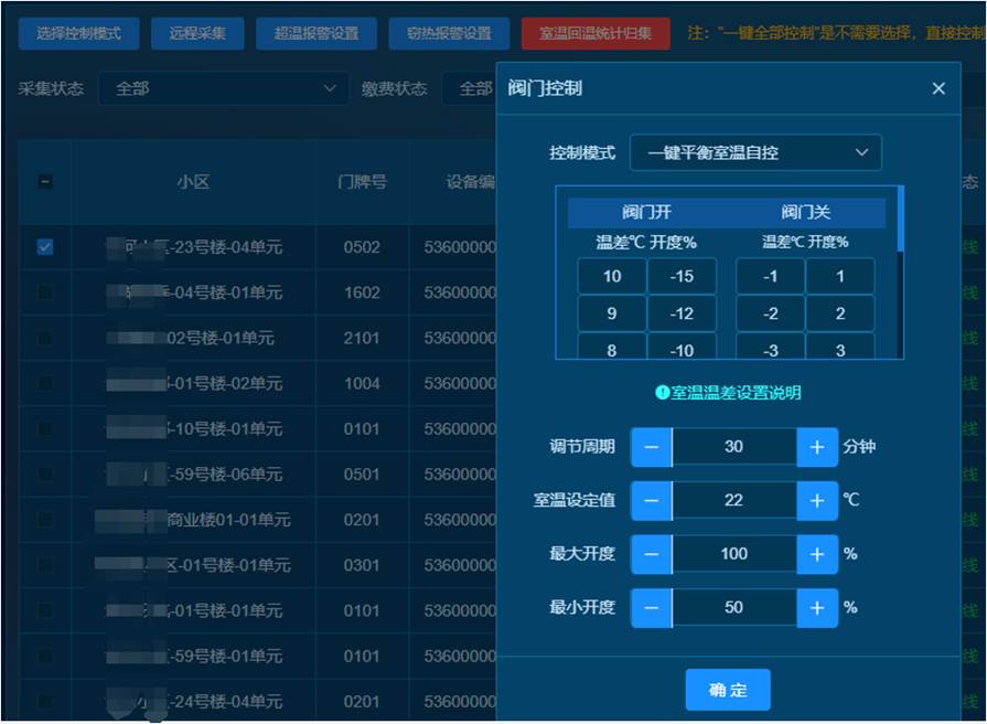 运行数据菜单列出所有小区的户阀信息,并可单独或者批量对指定户阀进行调控和设置;
