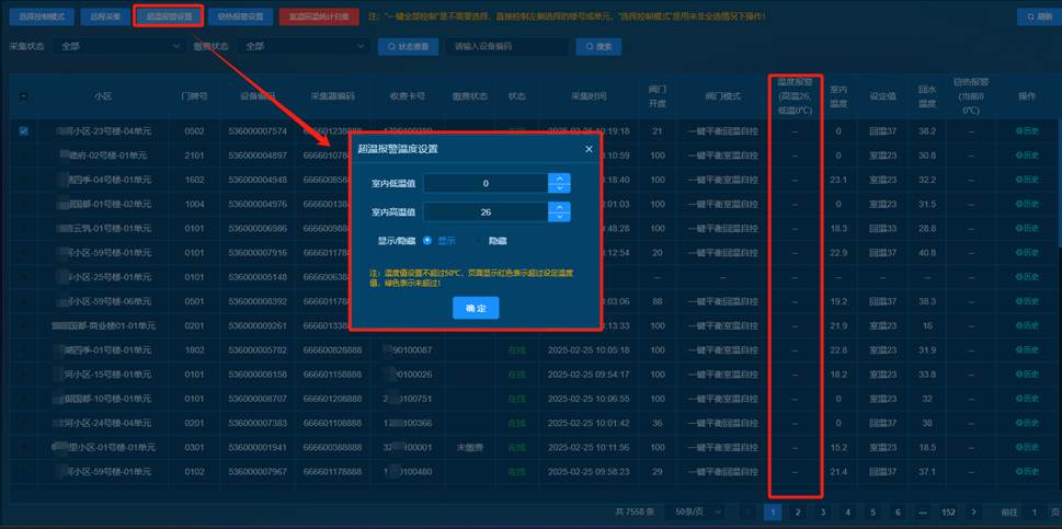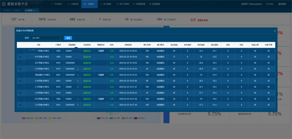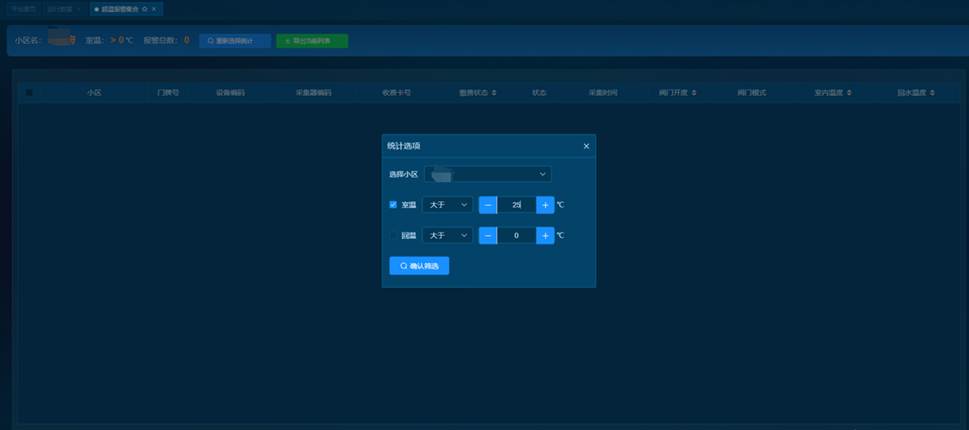 点击室温回温统计归集,弹出窗口选择指定小区的室温或回温设定值,可以根据不同需求查询指定小区的统计数据