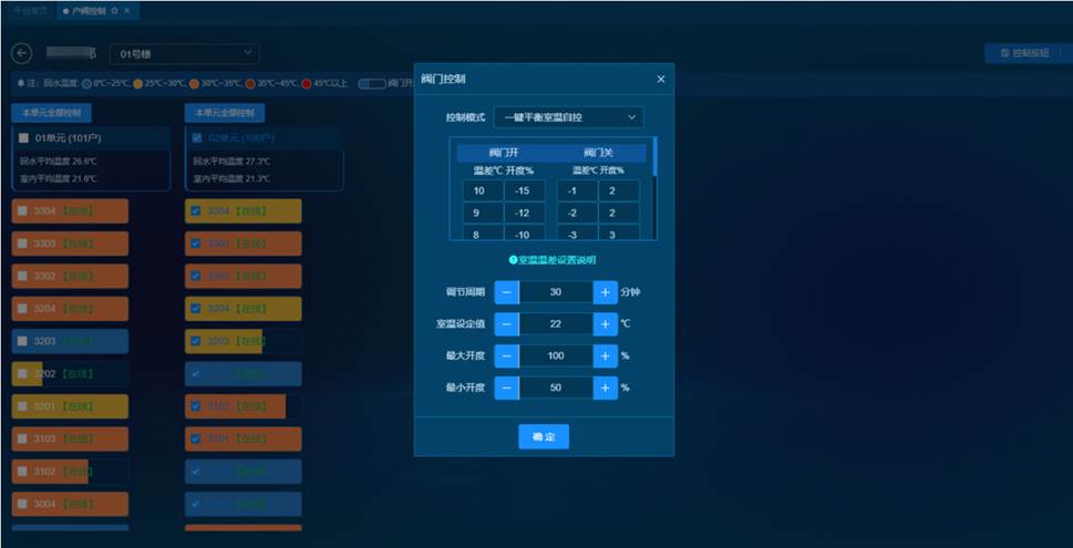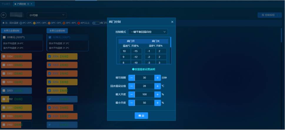 一键平衡室温自控:选择一键平衡室温自控,是根据采集的室温进行调节,可以设置调节周期、室温设定值、最大开度、最小开度,下发后可以根据顶部的调控策略进行调整,同时调控策略也是可以根据需求进行设置,例如采集的室温温度为30℃,设置的室温温度为28℃,那么温差是-2℃,那么户阀将执行阀门关温差为-2的策略,阀门关闭2%;