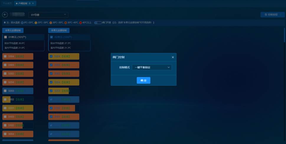 页面其他按钮:选择楼号,根据指定楼号进行控制;单元批量控制,根据指定小区单元进行控制;指定阀门控制,返回列表等。